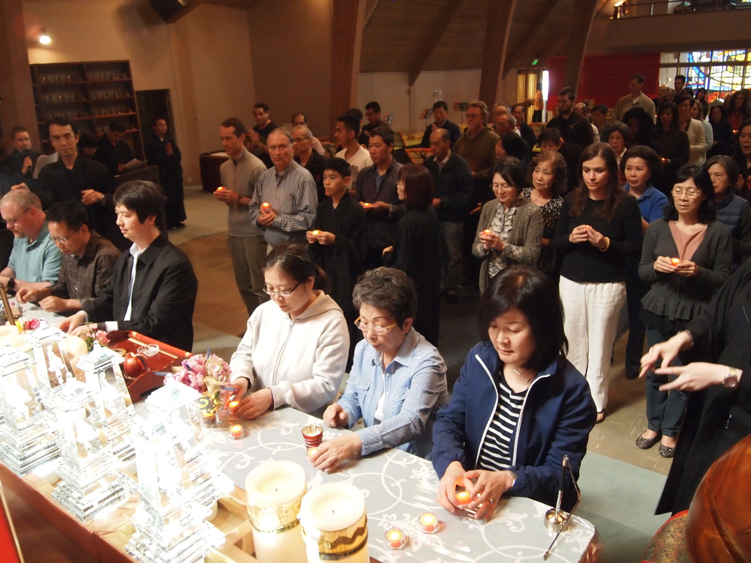 法會介紹 眾生無邊誓願度 法會介紹 佛寶寺每月一次於星期天舉辦法會,歡迎社會大眾參與。法會分為幾個階段,初次參與者若不熟悉流程,歡迎向大眾法師詢問。 迎請主法法師法會一開始,大眾合掌恭請主法法師入壇主法,以表達對三寶(佛、法、僧)的恭敬之意。問訊與禮拜問訊和禮佛可以幫助我們去除我執與我慢。問訊和禮拜,表達了我們對佛陀種種功德的至誠敬意,感恩佛陀以慈悲與智慧啟發我們本具的自性。誦經經典是法會儀軌的一部份。藉由誦經共修,可以消除業障、培養清淨心,並將誦經功德回向一切有情眾生、祈願世界和平安樂。供養供養,即是行布施,讓我們放下貪愛執著,有助於長養我們的慈悲心。法會上的供養包括燈、花、香等等。燈,象徵我們本具的智慧。智慧的明燈可以照破無明的黑暗。花,象徵世間的無常。我們在欣賞花朶短暫美麗的同時,也學習要觀照當下這念心。香,象徵著清淨、光潔以及善法的功德。香華遍滿十方,福德普薰眾生。行儀大眾藉由法會深化修行,並將功德回向一切有情眾生。法會上行禮如儀,表達了對於佛陀智慧與慈悲的恭敬與感恩。 Meaning of Dharma Ceremonies 點供光明燈 燃起佛前燈滅除心頭火願以大智慧照破眾無明 意義 消災及超薦法會 「消災」是恭請三寶誦經持咒,仰仗三寶慈力, 以一心真誠恭敬,以祈風調雨順,消除諸種災障,使自己和陽上親眷延壽消災,增延福慧,諸事順遂,使法界祥和清明。「超薦」是為亡靈及累劫冤親債主超拔追薦並功德迴向,令其業障消除,離苦得樂,超生善道。 所有課程活動皆免費,歡迎贊助道場,隨喜發心,功德無量。 贊助道場